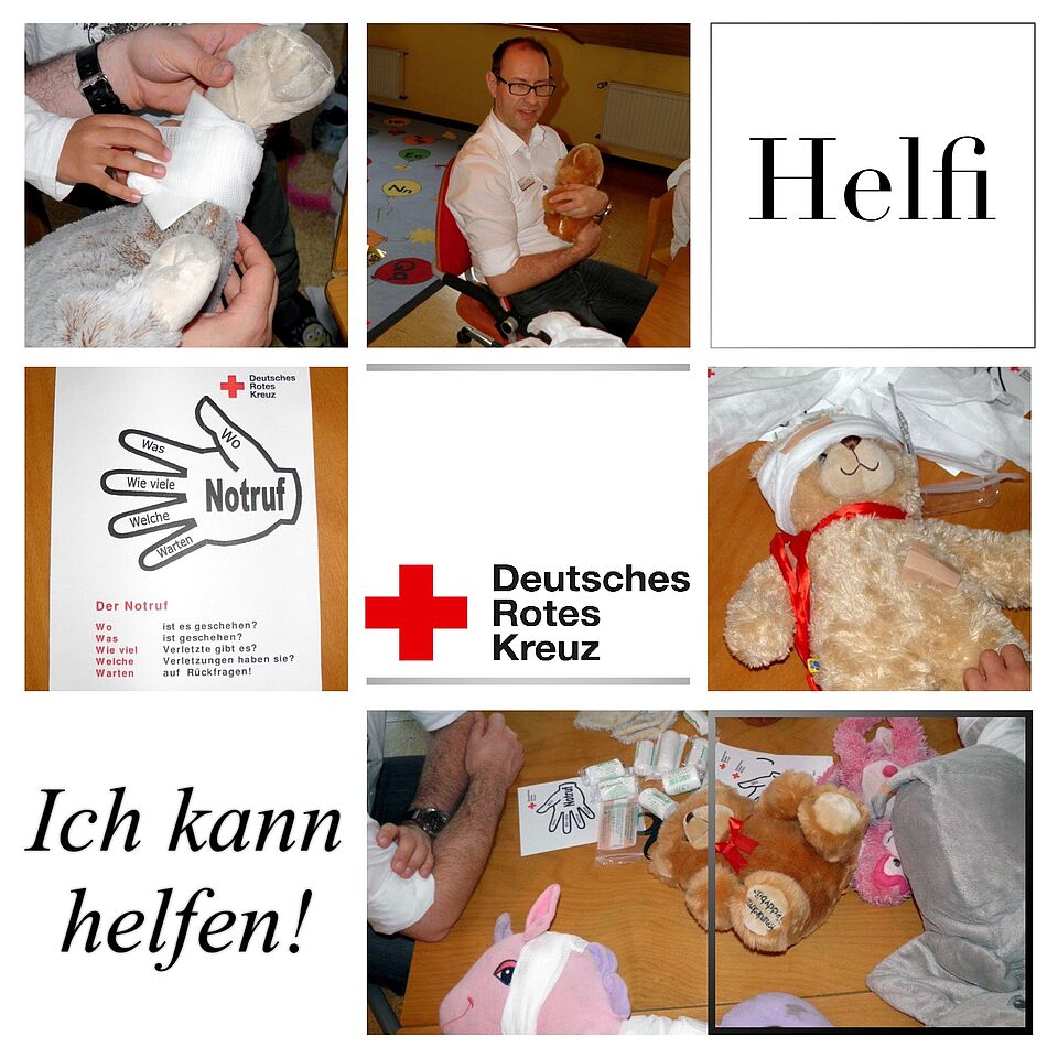 Der HELFI-Kurs soll bereits Vorschulkindern das Thema „Erste Hilfe“ näherbringen. An diesem Tag waren Maik Heins, Kreisausbildungsleiter beim DRK-Kreisverband Mosbach, eine Erzieherin sowie sieben Vorschulkinder mit ihren Lieblingskuscheltieren anwesend.