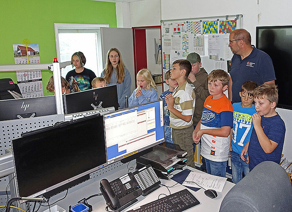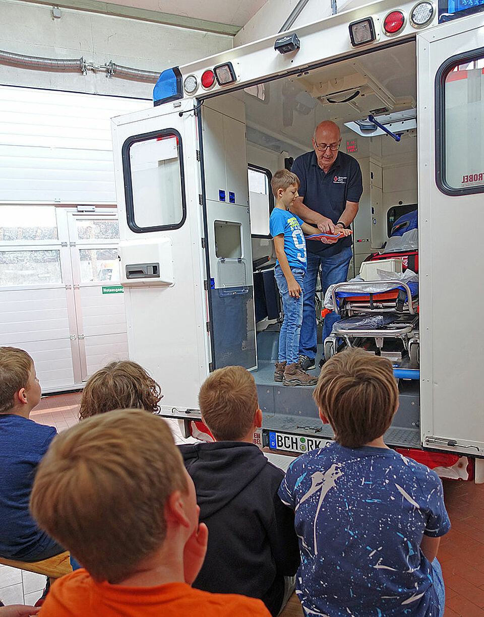 Wie sieht es in einer Rettungsleitstelle aus? Welche interessanten Dinge kann man in einem Rettungsfahrzeug entdecken? Und wie schaffen es Rettungshunde, Menschen in einem Versteck zu finden? Das alles und noch viel mehr erfuhren 28 Kinder und Jugendliche am Dienstag bei der Rettungswache in Mosbach. Spannend und kindgerecht erklärte Disponent Marc Schneider unter anderem, was passiert, wenn in der Leitstelle das Telefon klingelt und was man sagen muss, wenn man die 112 anruft. Viele Fragen der Kinder hatte auch Notfallsanitäter Uli Schreck zu beantworten, der den jungen Besuchern Nadeln, Verbandsmaterial und vieles mehr vorführte. Und natürlich waren Yoda, Rusty, Willi, Kiwi, Meggy und Hanka, die Vierbeiner der Rettungshundestaffel, eine Attraktion für die Besucher. Organisiert wurde der Tag von der Bereitschaft der DRK-Ortsgruppe Trienz, angeführt von Natalie Strom und Ayleen Baumann, im Rahmen des Sommerferienprogramms der Gemeinde Fahrenbach. Ein Dankeschön geht an die aufmerksamen Gäste, an alle Akteure des Rettungsdienstes und an Nadja Roos, Antonia Bracht, Sabine Weber und Johanna Schwarz-Krüger von der Rettungshundestaffel. Schon heute kommt wieder Besuch in die Rettungswache: Dann kommt die Bereitschaft der DRK-Ortsgruppe Schefflenz mit den Ferienprogrammkindern aus Schefflenz. Und Ende August statten die Kinder aus Obrigheim dem DRK Mosbach einen Besuch ab.