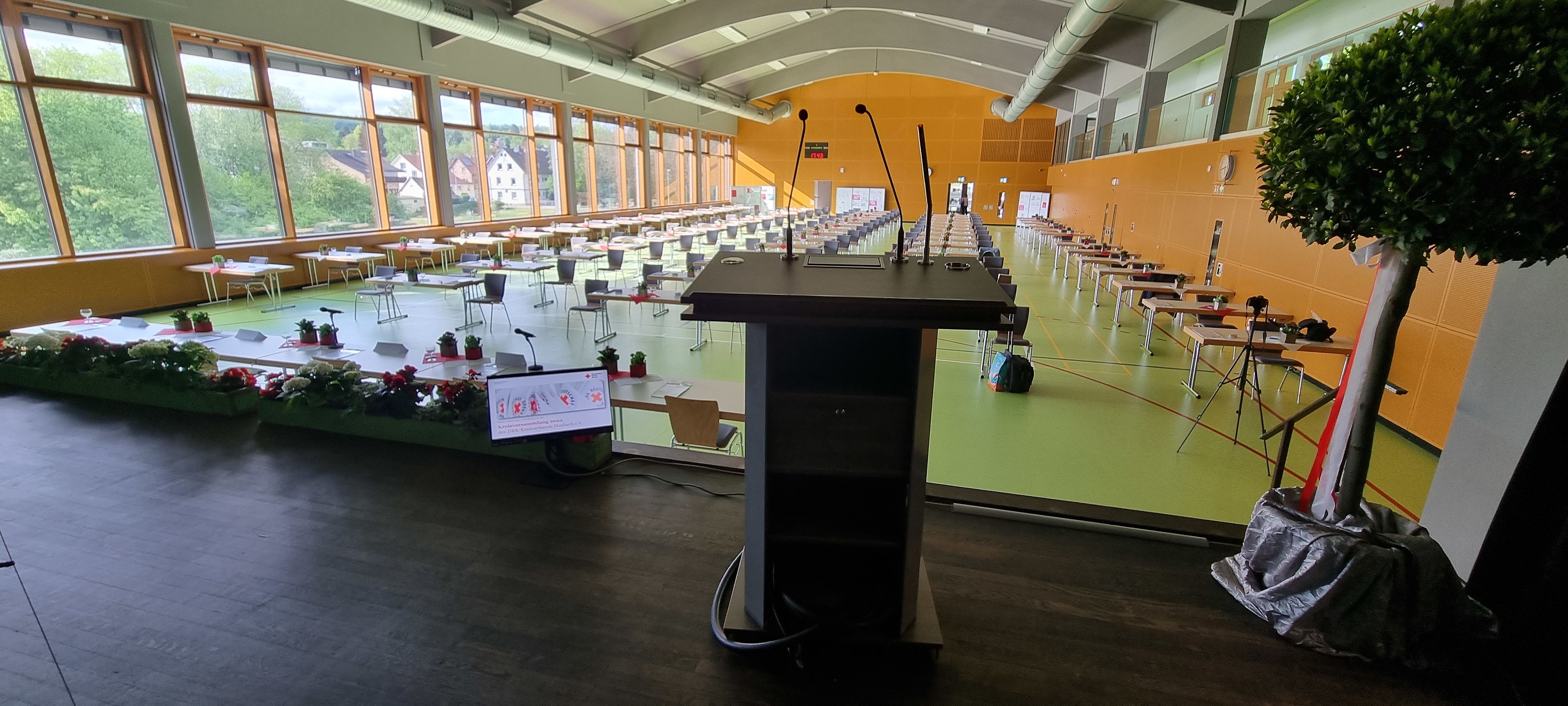 In seiner Ansprache freute sich Lauth, den Mitgliedern nach drei Jahren einmal wieder leibhaftig begegnen zu dürfen - wenn auch in einer merkwürdigen Tischordnung, die dem gebotenen Abstand von 1,50 Meter gerecht wurde. Besondere Grüße galten den Ehrengästen Ehrenpräsident SGH Ludwig Prinz von Baden und den Ehrenmitgliedern Alfred Uihlein, Hermann Schulz und Linus Vetter sowie dem stellvertretenden Kreisbrandmeister Bruno Noe und Kreisbereitschaftsleiter Dominic Burger-Graser als Vertreter des Kreisverbands Buchen. Grüße ließen Nina Warken und Peter Hauk ausrichten. Beide unterstützen die Anliegen des Kreisverbands, dankte Lauth. Barbara Bosch, die Präsidentin des DRK-Landesverbands Baden-Württemberg und Staatsrätin für Zivilgesellschaft und Bürgerbeteiligung, würdige er nach ihrer Ansprache als engagierte und couragierte Vertreterin des DRK-Gedankens. Viele Anknüpfungspunkte gibt es mit der Landkreisverwaltung. Für die gute Zusammenarbeit dankte Lauth dem Ersten Landesbeamten Dr. Björn-Christian Kleih, der nach einem Grußwort auch die Leitung für die Wahl des Präsidenten übernahm. Bürgermeister Haas stellte nicht nur den Tagungsort, die generalsanierte Schwarzachhalle vor, sondern seine Gemeinde insgesamt. Besonders lobte er den diesjährigen Ehrenamtspreisträger Patrick Haag vom DRK-Ortsverein Schwarzach. Einen zweiten Platz erzielte die DRK-Rettungshundestaffel. Aus Zeitgründen wurde auf die Ehrung langjähriger Mitglieder verzichtet. Sie wird an einem Extra-Termin stattfinden, um das Engagement der treuen DRKler angemessen zu würdigen.