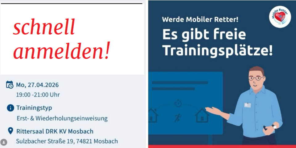 Dann schnell zum Einweisungstraining am 27.4.2026 im Rittersaal, Sulzbacher Straße 17, 19 bis 21 Uhr in Mosbach (über der Leitstelle) anmelden! Das geht direkt auf der Seite
