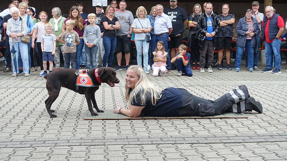 Zwischen den beiden Schauübungen demonstrierte die Rettungshundestaffel des DRK-Kreisverbandes das Können der Vierbeiner, die bei der Vermisstensuche immer wieder im Einsatz sind, auch über den Landkreis hinaus. Die Vorführungen moderierte Staffelleiterin Nadja Roos.