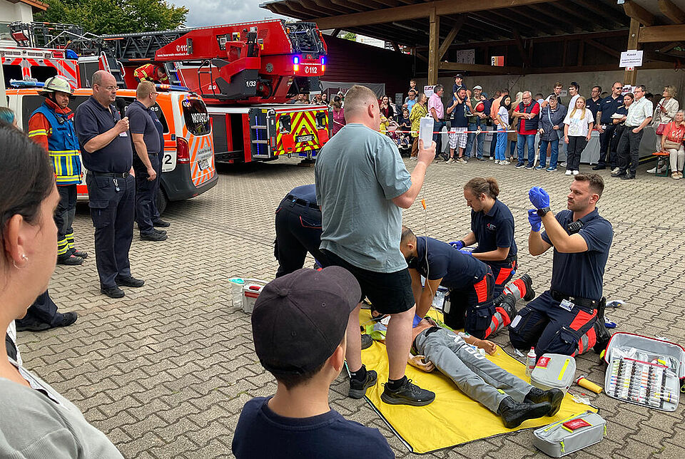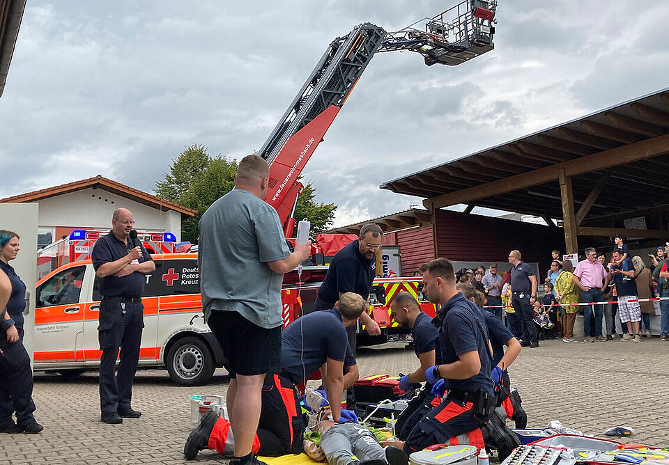 Besondere Aufmerksamkeit erzielten die Einsatzfahrzeuge und die Schauübungen. Wie die Rettung eines Patienten aus einem oberen Stockwerk per Drehleiter abläuft, zeigte der Rettungsdienst zusammen mit der Feuerwehr Mosbach, Abteilung Mosbach-Stadt, anschaulich und lebendig moderiert von Henning Waschitschek.