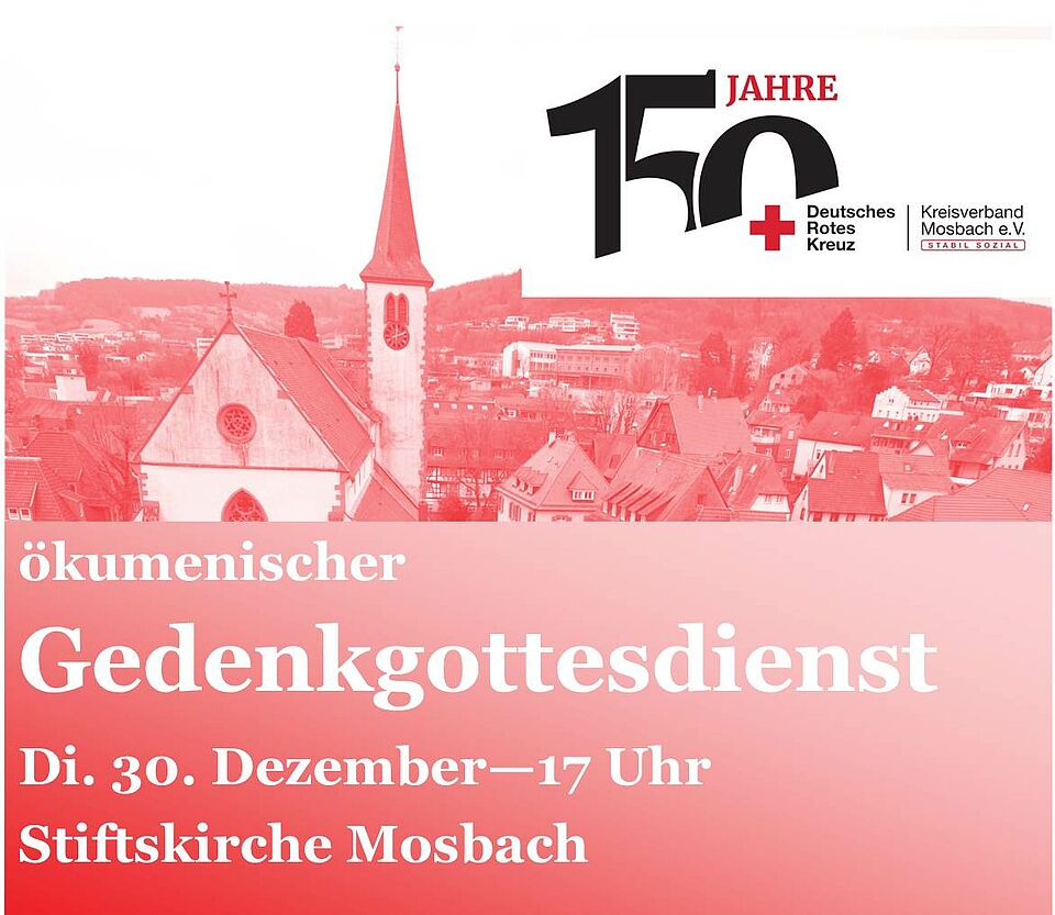 Mit einem ökumenischen Gedenkgottesdienst lässt der DRK-Kreisverband Mosbach das Jubiläumsjahr „150 Jahre Rotes Kreuz in Mosbach“ am Dienstag, 30. Dezember 2025, um 17 Uhr, in der Mosbacher Stiftskirche festlich und besinnlich ausklingen. Das Datum erinnert an den Gründungstermin: Am 30. Dezember 1875 wählte der Frauenverein Mosbach seinen ersten Vorstand. Dankbar will man an die lange Tradition des Helfens in Mosbach erinnern, und so steht das Thema des barmherzigen Samariters im Mittelpunkt des Gottesdienstes, der vom Bezirksbläserkreis musikalisch umrahmt wird. Die Bevölkerung ist herzlich willkommen.
